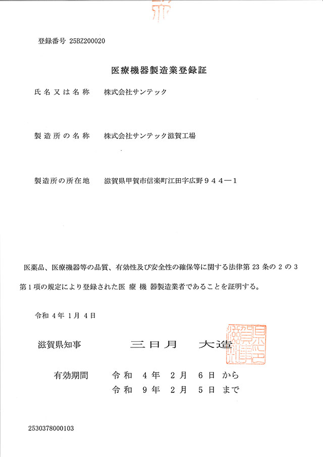 滋賀工場 医療機器製造業許可 ※京都本社から滋賀工場へ移管